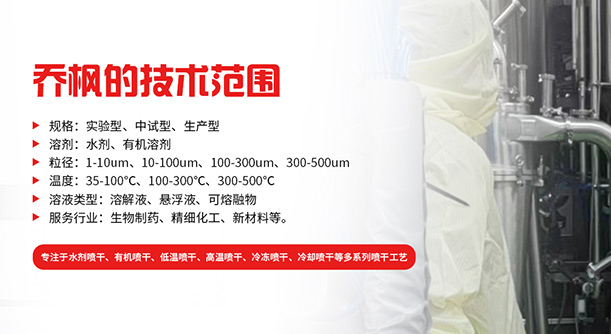 上海喬楓實業(yè)有限公司,成立于2012年,是從事噴霧干燥設(shè)備的研發(fā)設(shè)計、生產(chǎn)、銷售(小型噴霧干燥機,實驗型噴霧干燥機,35℃低溫噴霧干燥機,有機溶劑噴霧干燥機,低溫閉式循環(huán)噴霧干燥機、超細粉末噴霧干燥機、噴霧冷凍干燥機、真空噴霧干燥機、氣流噴霧干燥機,噴霧造粒干燥機,離心噴霧干燥機,沸騰制粒機等)和售后于一體的綜合性公司,本公司現(xiàn)成為一家致力于為生物制藥、精細化工、新能源、陶瓷造粒及食品工程等領(lǐng)域提供全套解決方案的整線交鑰匙工程企業(yè)。